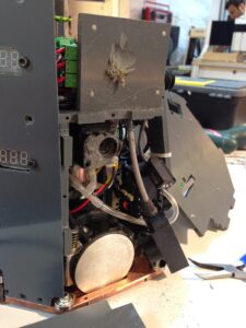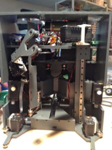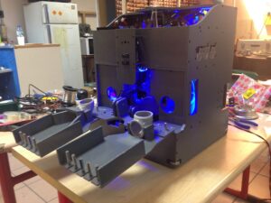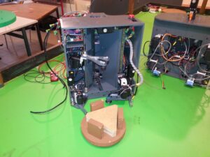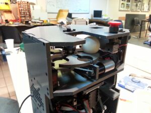 - L’évacuation des fruitmouths dans le barillet se fait latéralement à l’aide de petites portes grâce à 2 AX12. les fruitmouths tombent sur deux petits tapis roulant.