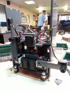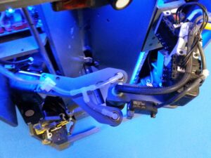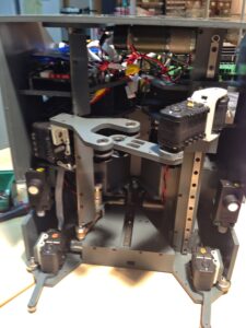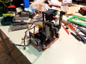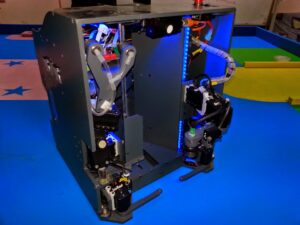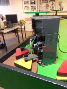 - Le robot comprend un ascenseur asservi en position. Le bras sur l’ascenseur se compose de 2 AX12 et utilise une ventouse pour manipuler les feux.