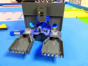 - Le robot possède une grosse griffe pivotante qui tourne à l’aide d’un motoréducteur de rapport 132:1 asservi en position. Pour récupérer les fruitmouths le robot baisse sa double griffe, puis recule, remonte la griffe et avance de nouveau pour faire tomber deux fruitmouths. il recommence l’opération 2 fois pour vider un arbre.