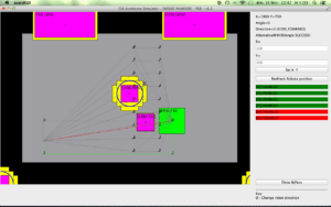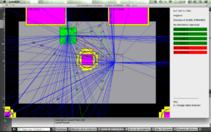 Dernier logiciel, une interface permettant de visualiser les déplacements du robot sur le terrain. L’intérêt est de confronter visuellement les déplacements vu par l’asservissement et vu en vrai par nos yeux émerveillés. Cela nous permet ainsi de voir clairement si un décalage de position est causé par des problèmes d’odométrie ou par des mauvaises coordonnées lors d’un contournement ou autre.